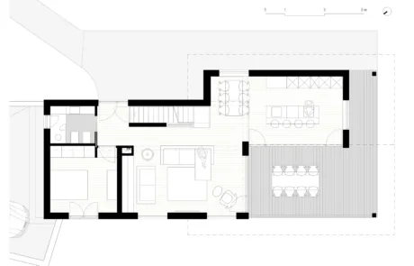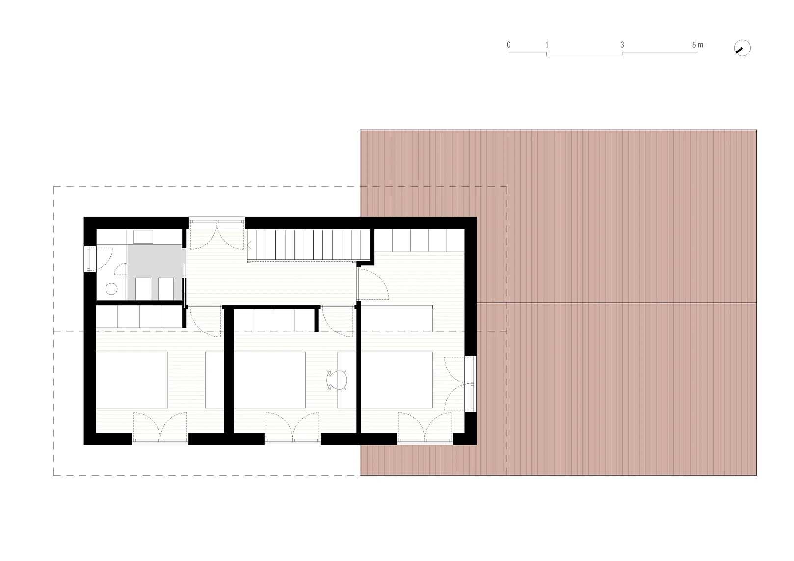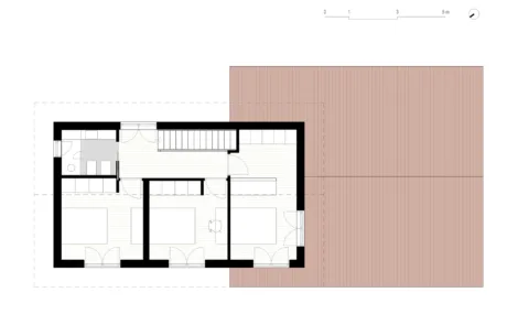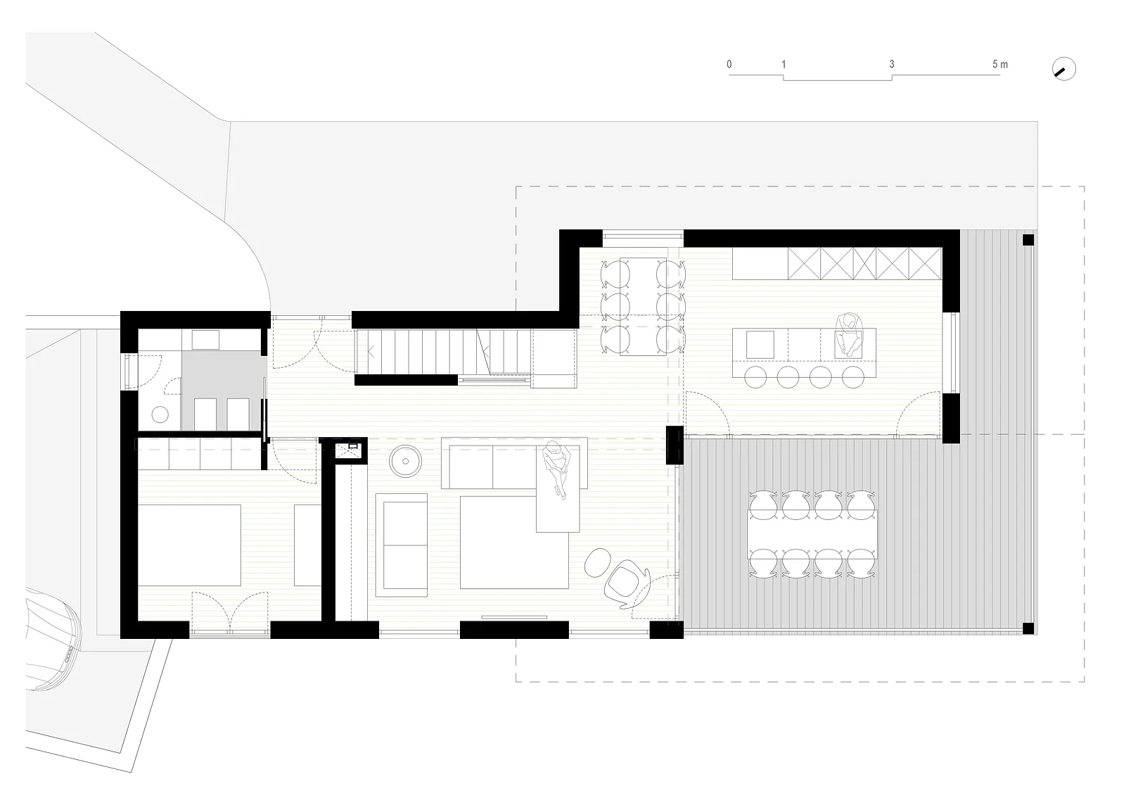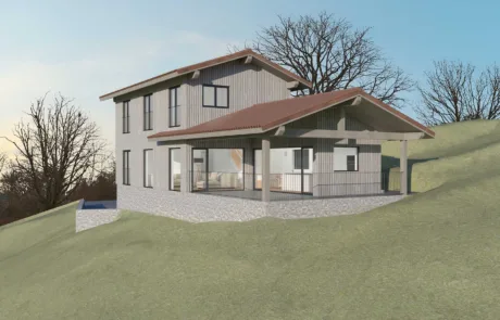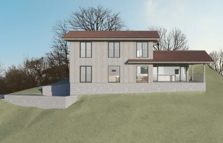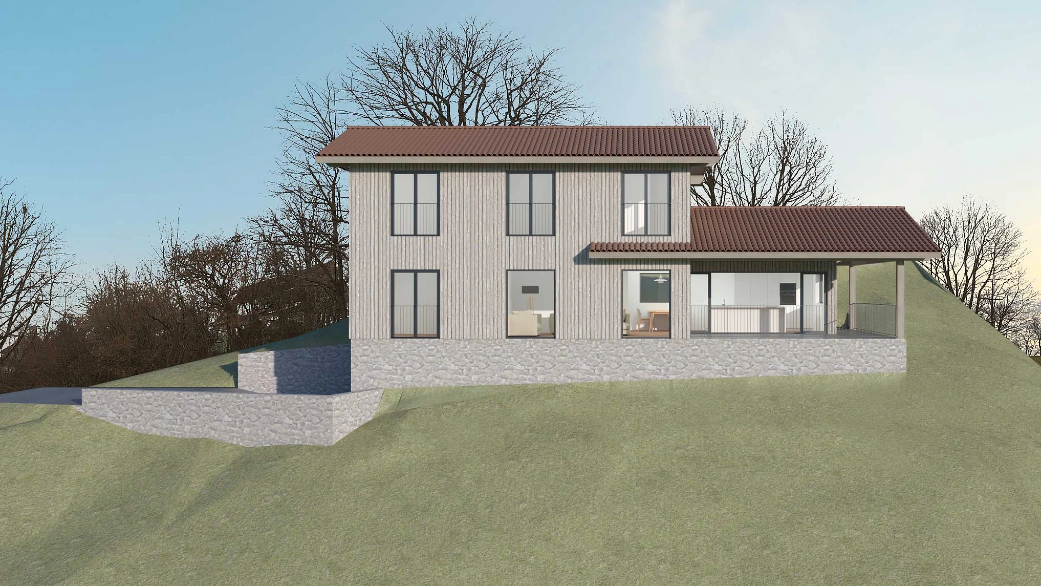 La vivienda se implanta en la zona más llana de una parcela con pendiente pronunciada. La edificación se dispone en dos volúmenes parcialmente retranqueados; uno en planta baja más grande y con porche integrado y otro de dos plantas. Ambos volúmenes con cubierta inclinada a dos aguas con aleros, adecuándose a la arquitectura del lugar.
