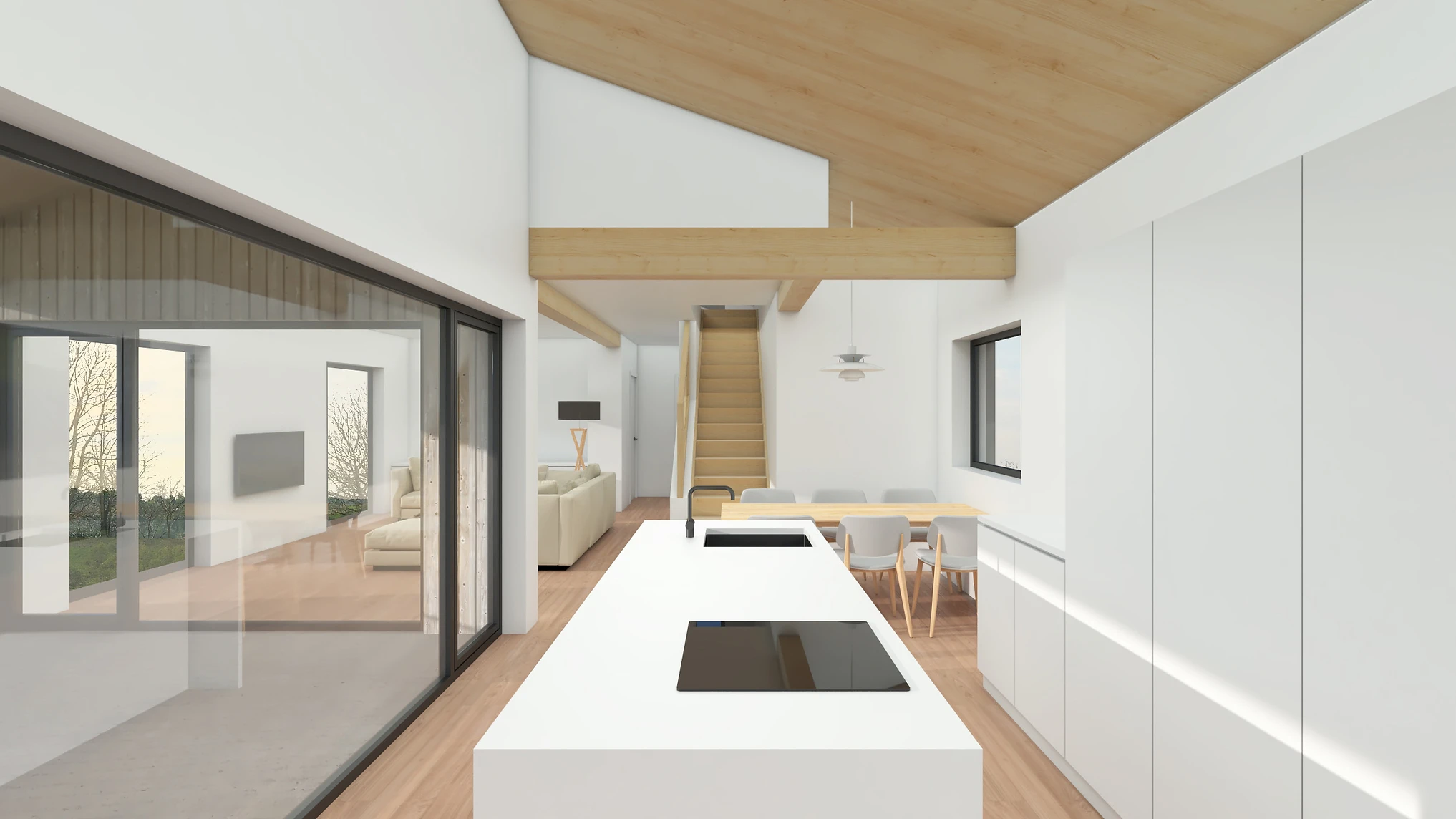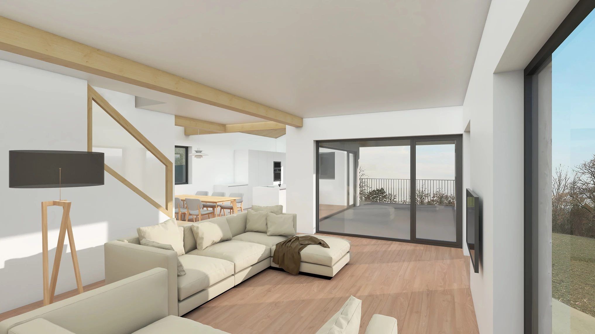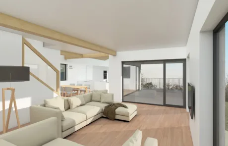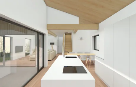 La estructura y envolvente sobre rasante es de entramado ligero de madera; gracias a ello, además de acortar el tiempo de ejecución de obra y con los espesores de aislamiento que cuenta la vivienda; se ha conseguido que su calificación energética sea A, logrando una vivienda de bajo consumo energético (27Kwh/m2a).